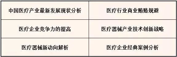 全國醫療產業(醫療器械)企業管理課程的設置旨在提高醫療行業的競爭實力,通過管理創新,使企業迅速發展。同時,我們也致力于搭建一個極具價值有影響力的中國醫療器械行業精英交流的高端資源平臺!”